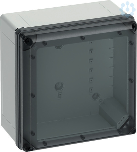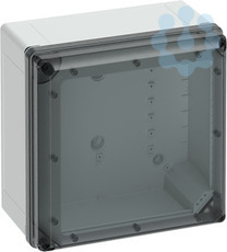 Leergehäuse, geeignet für die Installation in rauen Umgebungen und im ungeschützten Außenbereich, Kasten: glasfaserverstärktes Polycarbonat, grau, ähnlich RAL 7035, Deckel: Polycarbonat, mit transparentem Deckel