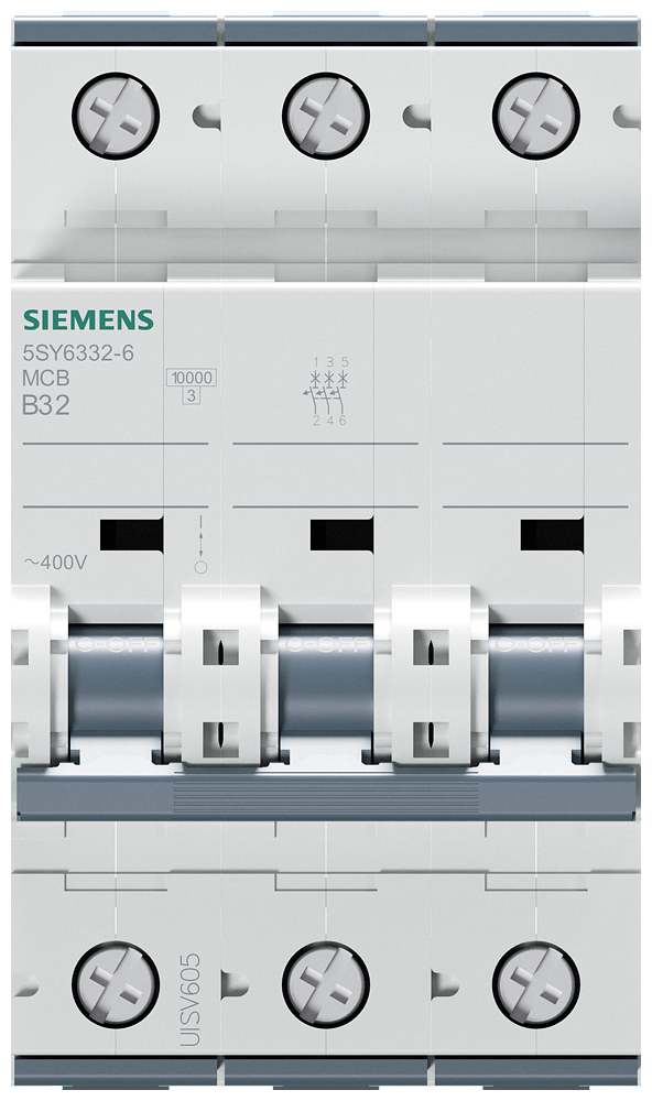 Leitungsschutzschalter 400V 6kA, 3-polig, B, 32A, T=70mm Leitungsschutzschalter SENTRON 5SY6 für den sicheren Kurzschluss- und Überlastschutz für Wohngebäude, Zweckbau und besondere Industrieanwendungen. Werkzeuglose Montage und Demontage des Geräts mit Hilfe eines Zweifachschiebers. Beliebige Kombination von Leitern und Sammelschiene durch Doppelkammerklemme. Einfache Verdrahtung der Einspeisung durch die hinten liegende Sammelschiene. Die Leitungsschutzschalter 5SY sind erhältlich in 1-, 2-, 3-, 4- sowie in 1+N- und 3+N-poliger Ausführung. Das komplette Zubehör ist einheitlich für alle Leitungsschutzschalter 5SY verwendbar. Einfach sicher mit den Schutzgeräten von SENTRON.
