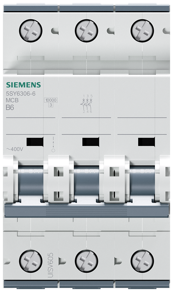 Leitungsschutzschalter 400V 6kA, 3-polig, B, 6A, T=70mm Leitungsschutzschalter SENTRON 5SY6 für den sicheren Kurzschluss- und Überlastschutz für Wohngebäude, Zweckbau und besondere Industrieanwendungen. Werkzeuglose Montage und Demontage des Geräts mit Hilfe eines Zweifachschiebers. Beliebige Kombination von Leitern und Sammelschiene durch Doppelkammerklemme. Einfache Verdrahtung der Einspeisung durch die hinten liegende Sammelschiene. Die Leitungsschutzschalter 5SY sind erhältlich in 1-, 2-, 3-, 4- sowie in 1+N- und 3+N-poliger Ausführung. Das komplette Zubehör ist einheitlich für alle Leitungsschutzschalter 5SY verwendbar. Einfach sicher mit den Schutzgeräten von SENTRON.