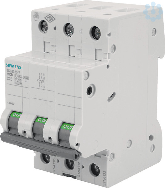 Leitungsschutzschalter 400V 6kA, 3-polig, C, 25A Leitungsschutzschalter SENTRON 5SL für den sicheren Kurzschluss- und Überlastschutz für Standardanwendungen im Wohn- und Zweckbau.Werkzeuglose Montage und Demontage des Geräts. Einfache Verdrahtung der Einspeisung durch die hinten liegende Sammelschiene.Die Leitungsschutzschalter 5SL sind erhältlich in 1-, 2-, 3-, 4- sowie in 1+N- und 3+N-poliger Ausführung sowie in weiteren Sondertypen.Das umfangreiche Zubehör, wie z.B. Hilfsschalter, ermöglicht die vielfältige Erweiterung der Funktionen.Einfach sicher mit den Schutzgeräten von SENTRON.