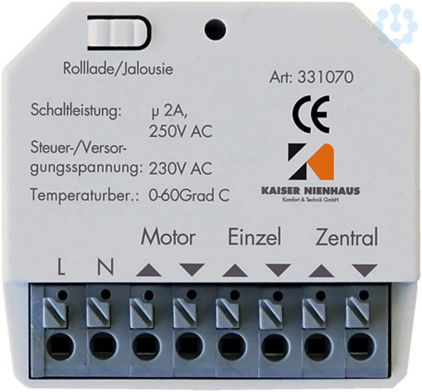 Mit diesem Mehrfachsteuergerät können sehr einfach komfortable Gruppensteuerungenaufgebaut werden. Es handelt sich um ein intelligentes Steuergerät für einen Motor mit zwei Steuereingängen. Die Vor-Ort-Bedienung des Gerätes kann mit einem Knopf am Gehäuse in wenigen Sekunden vom Rollladenbetrieb (120 Sekunden Selbsthaltung nach Tastbefehl) auf Jalousiebetrieb (Tippbetrieb bei Tastbefehl < 1 Sekunde; 120 Sekunden Selbsthaltung bei Tastbefehl >1 Sekunde) umgestellt werden. Der Zentralbefehl arbeitet immer im Totmannbetrieb und hat die höhere Priorität. Als Bedienelement können Taster, Schalter oder Zeitschaltuhren eingesetzt werden. Die Steuer- und Versorgungsspannung beträgt 230V (50Hz). Die praktischen Steckklemmen können einfach fixiert und wieder gelöst werden. Mit einer Bautiefe von gerade einmal 23mm ist das Gerät ideal für den Einsatz in Unterputzdosen geeignet. Abmessungen: 48x45x23mm