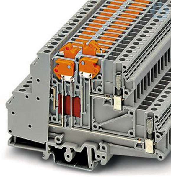 Messertrennklemme, mit Prüfbuchsenschrauben zur Aufnahme von Prüfsteckern, Nennspannung: 400 V, Nennstrom: 10 A, 1. und 2. Etage, Anschlussart: Schraubanschluss, Bemessungsquerschnitt: 4 mm², Querschnitt: 0,2 mm² - 4 mm², 2. Etage, Anschlussart: Schraubanschluss, Bemessungsquerschnitt: 4 mm², Querschnitt: 0,2 mm² - 4 mm², Montage: NS 35/7,5, NS 35/15, NS 32, Farbe: grau