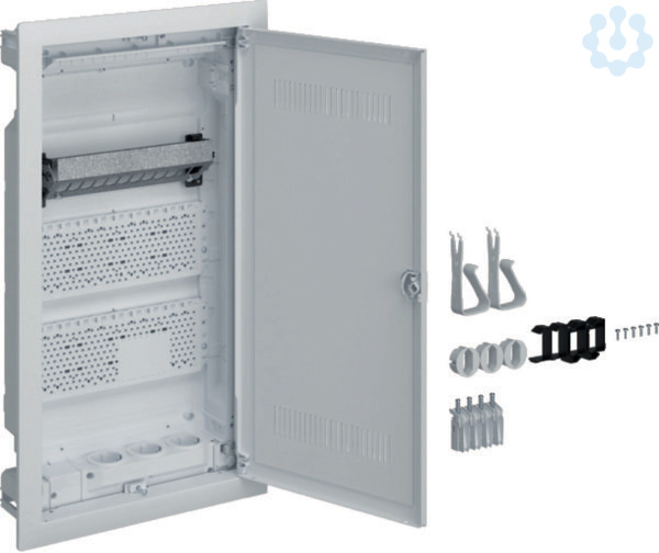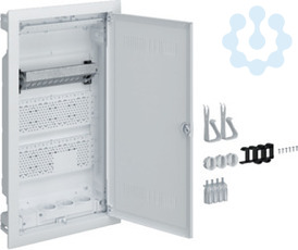 Installationskleinverteiler Hohlwand, 3-reihig, IP Standard 30, Schutzklasse II. Geeignet für VDI-Komponenten, DIN VDE 61439-3 konform. Ausstattung: Kunststoff-Mauerkasten mit Leitungsabfang, Wasserwaage, Schnellfixierungshebel. Lüftungstür aus Stahlblech mit Kunststoffeinsatz, Blendrahmen verdrehbar, Putzausgleich 15 mm. Patch Panel und DIN-Hutschiene im oberen Anschlussraum, 3-fach Schutzkontaktsteckdose im unteren Bereich.