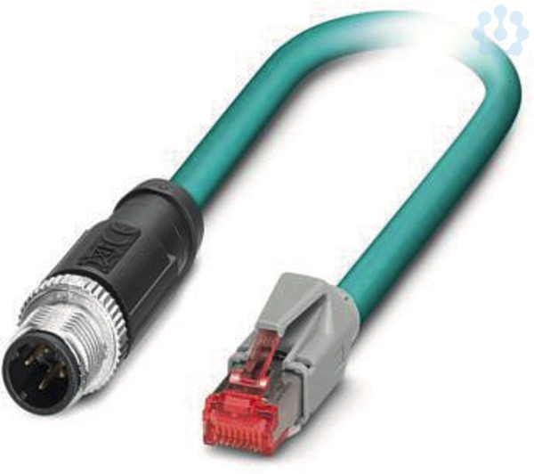 Netzwerkkabel, Ethernet CAT5 (100 MBit/s), 4-polig, PUR halogenfrei, wasserblau RAL 5021, geschirmt (Advanced Shielding Technology), Stecker gerade M12, Kodierung: D / IP67, auf Stecker gerade RJ45 / IP20, Kabellänge: 1 m