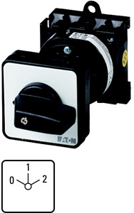 Polumschalter, Sortiment: Steuerschalter, Typkenner: T0, mit schwarzem Knebel und Frontschild, Kontakte: 8, Schutzart: Front IP65, Bauform: rückseitiger Einbau, Schaltfunktion: Dahlander-Schaltung, 2 Drehzahlen, Schaltwinkel: 60 °, Schaltverhalten: rastend, mit 0-Stellung, Frontschild: 0-1-2, Bemessungsbetriebsleistung AC-23A, 50 - 60 Hz 400 V: P = 5,5 kW, Bemessungsdauerstrom: Iu = 20 A, 4 Baueinheit(en), Normen und Bestimmungen: IEC/EN 60947, VDE 0660, IEC/EN 60204, CSA, UL, Lasttrennschalter nach IEC/EN 60947-3