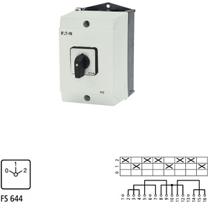 Polumschalter, Sortiment: Steuerschalter, Typkenner: T3, mit schwarzem Knebel und Frontschild, Kontakte: 8, Schutzart: IP65, Bauform: Oberflächenmontage, Schaltfunktion: Dahlander-Schaltung, 2 Drehzahlen, Schaltwinkel: 60 °, Schaltverhalten: rastend, mit 0-Stellung, Frontschild: 0-1-2, Bemessungsbetriebsleistung AC-23A, 50 - 60 Hz 400 V: P = 15 kW, Bemessungsdauerstrom: Iu = 32 A, 4 Baueinheit(en), Normen und Bestimmungen: IEC/EN 60947, VDE 0660, IEC/EN 60204, CSA, UL, Lasttrennschalter nach IEC/EN 60947-3