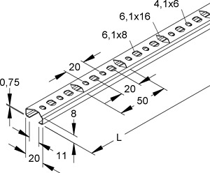 Reihenschiene Modell 2910, C-Profil ähnlich DIN EN 60715, mit querliegender Abbrechlochung. Passende Bügelschellen (BA... und BAK...) können nur vom Profilende aus eingeschoben werden. Abmessungen (ca. Maße) Höhe H x Breite B x Materialstärke t : 8 x 20 x 0,75 mm Schlitzweite : 11 mm Profillochung : 4,1 x 6 mm und 6,1 x 8 mm mittiger Abstand : 20 mm Abbrechlochung : 6,1 x 16 mm mittiger Abstand : 50 mm Lieferlänge L : 2000 mm Werkstoff : Stahl, bandverzinkt nach DIN EN 10346