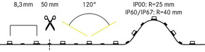 LED-Flexplatine, 50 mm, CRI > 90, 9,6 W / m, IP00, LED-Weißlicht, 2.400K, CRI > 90 LED-Flexplatine zur dekorativen, technischen, sowie effizienten Beleuchtung von Lichtvouten, Linearanwendungen und Hinterleuchtungen, Grund- bzw. Allgemeinbeleuchtung von Räumen, architektonische Anwendungen und für Bereiche, in denen eine hohe Ausleuchtung gewünscht ist, wie z.B. indirekte oder direkte Beleuchtungen, Lichtdecken, Gastronomiebeleuchtungen und vielem mehr.Länge: 50.0 mm Lampenleistung je Meter: 9.6 W/m, Lichtstrom je Meter: 760.0 lm/m, Schutzart raumseitig: IP00, Schutzklasse: III, Spannung: 24V DC, Abstrahlwinkel: 120.0 °, 120 LEDs pro Meter, Chip-Abstand (Short Pitch) : 8,3mm. Zur Individuellen Anwendung kann die LED-Flexplatine alle 50 mm eingekürzt werden. Die maximale Systemlänge von 5.000mm darf mit einer Einspeisung nicht überschritten werden.