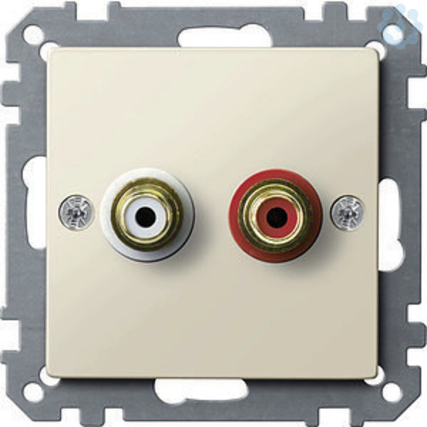 Mit zwei Chinch-Steckbuchsen. Farben Rot und Weiß. Vergoldete Kontakte. Kontakte mit Lötanschlüssen. Material Thermoplast brillant. Farbe weiß glänzend.