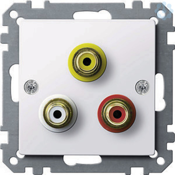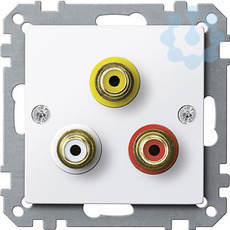 Mit drei Chinch-Steckbuchsen. Farben Gelb, Rot und Weiß. Vergoldete Kontakte. Kontakte mit Lötanschlüssen. Material Thermoplast brillant, antibakteriell. Glatte und selbstdesinfizierende Oberfläche mit antibakterieller Wirkung. Farbe ähnlich RAL 9016. Farbe aktivweiß glänzend.