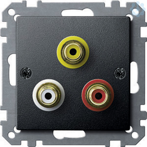 Mit drei Chinch-Steckbuchsen. Farben Gelb, Rot und Weiß. Vergoldete Kontakte. Kontakte mit Lötanschlüssen. Material Thermoplast edelmatt. Farbe anthrazit.