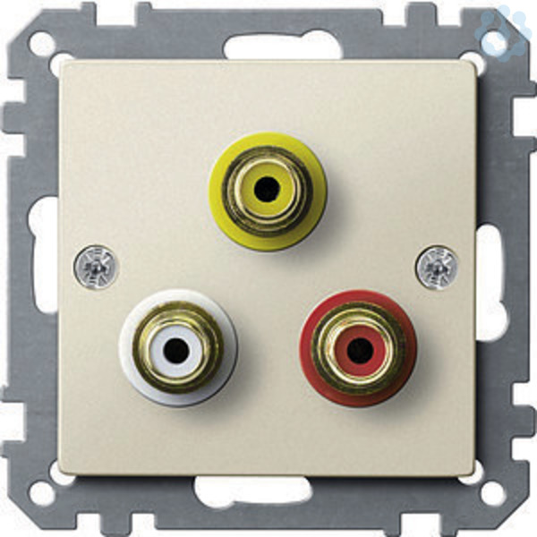 Mit drei Chinch-Steckbuchsen. Farben Gelb, Rot und Weiß. Vergoldete Kontakte. Kontakte mit Lötanschlüssen. Material Thermoplast edelmatt. Farbe weiß.