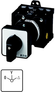 Stern-Dreieck-Schalter, Sortiment: Steuerschalter, Typkenner: T3, mit schwarzem Knebel und Frontschild, Kontakte: 8, Schutzart: Front IP65, Bauform: rückseitiger Einbau, Schaltwinkel: 60 °, Schaltverhalten: rastend, mit 0-Stellung, Frontschild: 0-Y-D, Bemessungsbetriebsleistung AC-23A, 50 - 60 Hz 400 V: P = 15 kW, Bemessungsdauerstrom: Iu = 32 A, 4 Baueinheit(en), Normen und Bestimmungen: IEC/EN 60947, VDE 0660, IEC/EN 60204, CSA, UL, Lasttrennschalter nach IEC/EN 60947-3