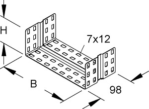 Stoßstellenverbinder, einstückig, U-förmig, für Kabelrinnen, einschließlich anteilmäßigem Befestigungszubehör. Verwendung für : Kabelrinnen mit 85 mm Kantenhöhe Abmessungen (ca. Maße) H x B : 73 x 97 mm Werkstoff : Stahl, bandverzinkt nach DIN EN 10346