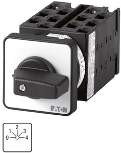Stufenschalter, Sortiment: Steuerschalter, Normen und Bestimmungen: IEC/EN 60947, VDE 0660, IEC/EN 60204, CSA, UL, Lasttrennschalter nach IEC/EN 60947-3, Typkenner: T0, mit schwarzem Knebel und Frontschild, Kontakte: 12, Stufenanzahl: 4 Stufen, 45°, Schutzart: Front IP65, Bauform: Einbau, Schaltwinkel: 45 °, Schaltverhalten: rastend, mit 0-Stellung, 6 Baueinheit(en), Bemessungsdauerstrom: Iu= 20 A, Frontschild: 0-4