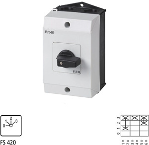 Stufenschalter, Sortiment: Steuerschalter, Normen und Bestimmungen: IEC/EN 60947, VDE 0660, IEC/EN 60204, CSA, UL, Lasttrennschalter nach IEC/EN 60947-3, Typkenner: T3, mit schwarzem Knebel und Frontschild, Kontakte: 3, Schutzart: IP65, Bauform: Oberflächenmontage, Schaltwinkel: 45 °, Schaltverhalten: rastend, mit 0-Stellung, 2 Baueinheit(en), Bemessungsdauerstrom: Iu= 32 A, Frontschild: 0-3