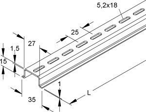Tragschiene Modell 2934, Hutschiene 35 mm, Tragschiene TS 35 ähnlich DIN EN 60715, gelocht. Verwendung für : Installationsgeräte und Reihenklemmen Abmessungen (ca. Maße) Höhe H x Breite B x Materialstärke t : 15 x 35 x 1,5 mm Breite B1 der Befestigungsebene : 27 mm Profillochung : 5,2 x 18 mm mittiger Abstand : 25 mm Lieferlänge L : 2000 mm Werkstoff : Stahl, galvanisch verzinkt nach DIN EN ISO 19598, dickschichtpassiviert