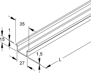 Tragschiene Modell 2934, Hutschiene 35 mm, Tragschiene TS 35 ähnlich DIN EN 60715, ungelocht. Verwendung für : Installationsgeräte und Reihenklemmen Abmessungen (ca. Maße) Höhe H x Breite B x Materialstärke t : 15 x 35 x 1,5 mm Breite B1 der Befestigungsebene : 27 mm Lieferlänge L : 2000 mm Werkstoff : Stahl, galvanisch verzinkt nach DIN EN ISO 19598, dickschichtpassiviert