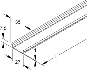 Tragschiene Modell 2933, Hutschiene 35 mm, Tragschiene TS 35 ähnlich DIN EN 60715, ungelocht. Verwendung für : Installationsgeräte und Reihenklemmen Abmessungen (ca. Maße) Höhe H x Breite B x Materialstärke t : 7,5 x 35 x 1 mm Breite B1 der Befestigungsebene : 27 mm Lieferlänge L : 2000 mm Werkstoff : Stahl, bandverzinkt nach DIN EN 10346