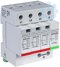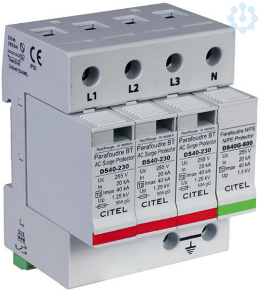 4-poliger Ableiter Typ 2 (C) für 230 V TT Netze (3+1). Netzfolgestromfreier Überspannungsableiter zum Einsatz in der Unterverteilung. Max. Ableitstoßstrom - Imax je Pol: 40 kA. Einfacher, werkzeugloser Schutzmodul Wechsel durch 2-teiligem Aufbau. Funktions- / Defektanzeige durch Optisches Sichtfenster und Fernsignalisierung Montage auf Hutprofilschiene 35 mm nach EN 50022. Geprüft nach IEC 61643-11