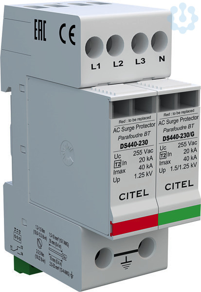 Kompakter (2TE), 4-poliger Ableiter Typ 2 (C) für 230 V TT Netze (3+1). Netzfolgestromfreier Überspannungsableiter zum Einsatz in der Unterverteilung. Max. Ableitstoßstrom - Imax je Pol: 40 kA. Einfacher, werkzeugloser Schutzmodul Wechsel durch 2-teiligem Aufbau. Funktions- / Defektanzeige durch Optisches Sichtfenster und Fernsignalisierung Montage auf Hutprofilschiene 35 mm nach EN 50022. Geprüft nach IEC 61643-11
