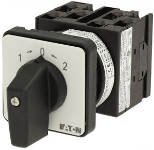 Umschalter, Sortiment: Steuerschalter, Typkenner: T0, mit schwarzem Knebel und Frontschild, Kontakte: 6, Schutzart: Front IP65, Bauform: Einbau, Schaltwinkel: 45 °, Schaltleistung: federnd, mit 0-Stellung, mit 2-seitigem Rückzug nach 0, Frontschild: 2>0<1, Bemessungsbetriebsleistung AC-23A, 50 - 60 Hz 400 V: P = 5,5 kW, Bemessungsdauerstrom: Iu = 20 A, 3 Baueinheit(en), Normen und Bestimmungen: IEC/EN 60947, VDE 0660, IEC/EN 60204, CSA, UL, Lasttrennschalter nach IEC/EN 60947-3