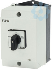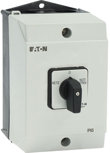 Umschalter, Sortiment: Steuerschalter, Typkenner: T3, mit schwarzem Knebel und Frontschild, Kontakte: 8, Schutzart: IP65, Bauform: Oberflächenmontage, Schaltwinkel: 60 °, Schaltverhalten: rastend, mit 0-Stellung, Frontschild: Netz-0-Notstrom, Bemessungsbetriebsleistung AC-23A, 50 - 60 Hz 400 V: P = 15 kW, Bemessungsdauerstrom: Iu = 32 A, 4 Baueinheit(en), Normen und Bestimmungen: IEC/EN 60947, VDE 0660, IEC/EN 60204, CSA, UL, Lasttrennschalter nach IEC/EN 60947-3