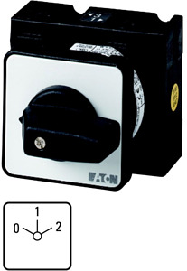 Umschalter, Sortiment: Steuerschalter, Typkenner: T3, mit schwarzem Knebel und Frontschild, Kontakte: 6, Schutzart: Front IP65, Bauform: Einbau, Schaltwinkel: 60 °, Schaltverhalten: rastend, mit 0-Stellung, Frontschild: 0-1-2, Bemessungsbetriebsleistung AC-23A, 50 - 60 Hz 400 V: P = 15 kW, Bemessungsdauerstrom: Iu = 32 A, 3 Baueinheit(en), Normen und Bestimmungen: IEC/EN 60947, VDE 0660, IEC/EN 60204, CSA, UL, Lasttrennschalter nach IEC/EN 60947-3