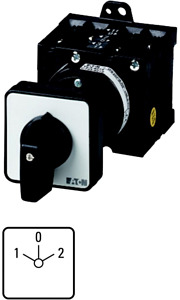 Umschalter, Sortiment: Steuerschalter, Typkenner: T3, mit schwarzem Knebel und Frontschild, Kontakte: 8, Schutzart: Front IP65, Bauform: rückseitiger Einbau, Schaltwinkel: 60 °, Schaltverhalten: rastend, mit 0-Stellung, Frontschild: 1-0-2, Bemessungsbetriebsleistung AC-23A, 50 - 60 Hz 400 V: P = 15 kW, Bemessungsdauerstrom: Iu = 32 A, 4 Baueinheit(en), Normen und Bestimmungen: IEC/EN 60947, VDE 0660, IEC/EN 60204, CSA, UL, Lasttrennschalter nach IEC/EN 60947-3
