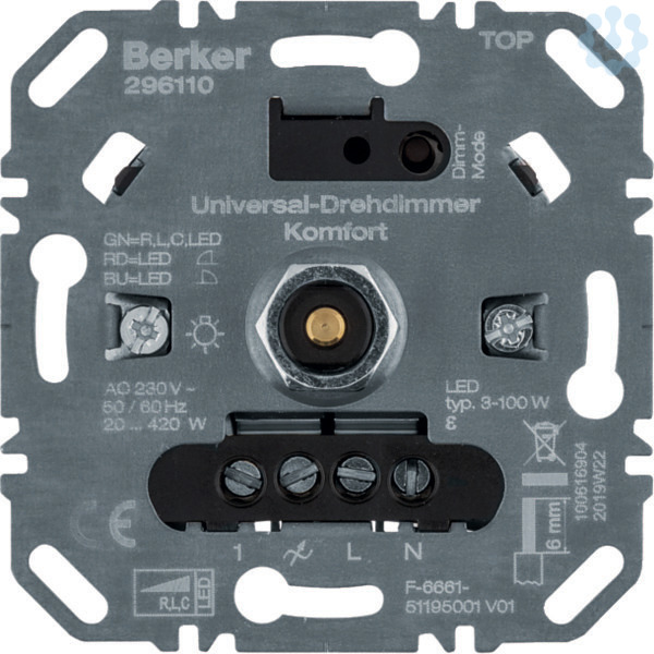Universal-Drehdimmer Komfort ermöglicht stufenlose Lichtregulierung durch Einflächenbedienung und Nebenstelleneingang für Taster. Erkennt selbstlernend die Lastart (Phasenan-/Phasenabschnitt oder LED-Phasenanschnitt). Ausgestattet mit Helligkeitsspeicher, Softanlauf, Inkrementalgeber sowie Schraubklemmen. Überlastsicher und kurzschlussfest durch elektronische Sicherung. Spannungsprüfung ohne Ausbau möglich. Nicht für induktive/kapazitive Lasten gemeinsam.