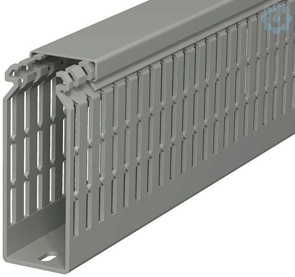 Verdrahtungskanal nach DIN EN 50085-2-3 inkl. Oberteil und Bodenlochung zur waagerechten und senkrechten Verlegung elektrischer Kabel und Leitungen im Schaltschrank. Ausführung als DIN-Kanal. Das Ausbrechen der Stege erfolgt werkzeuglos. Bodenbündiges Ausführen ist durch Sollbruchstellen möglich. Verjüngungen in den Seitenschlitzen verhindern das Herausfallen der Leitungen. Geprüft nach DIN EN 50085-2-3. Sonderlängen auf Anfrage.