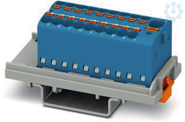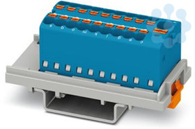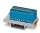 Verteilerblock, Block mit senkrechter Ausrichtung und integrierter Einspeisung, Nennspannung: 500 V, Nennstrom: 17,5 A, Anzahl der Anschlüsse: 19, Anschlussart: Push-in-Anschluss, Abgriff, Querschnitt: 0,14 mm² - 2,5 mm², Sammelanschluss, Bemessungsquerschnitt: 4 mm², Querschnitt: 0,2 mm² - 6 mm², Montageart: NS 35/7,5, NS 35/15, Farbe: blau