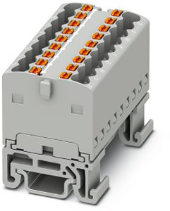 Verteilerblock, Block mit waagerechter Ausrichtung, Nennspannung: 500 V, Nennstrom: 17,5 A, Anzahl der Anschlüsse: 18, Anschlussart: Push-in-Anschluss, Querschnitt: 0,14 mm² - 2,5 mm², Montageart: NS 15, Farbe: grau