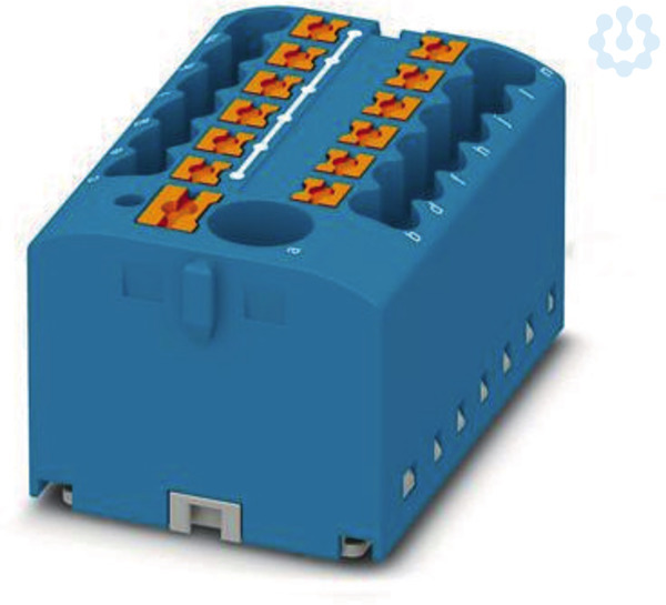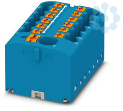Verteilerblock, Grundklemme mit Einspeisung, Nennspannung: 450 V, Nennstrom: 24 A, Anzahl der Anschlüsse: 13, Anschlussart: Push-in-Anschluss, Bemessungsquerschnitt: 2,5 mm², Abgriff, Querschnitt: 0,14 mm² - 4 mm², Push-in-Anschluss, Sammelanschluss, Bemessungsquerschnitt: 6 mm², Querschnitt: 0,5 mm² - 10 mm², Montageart: aufrasten auf Tragschienenadapter, Direktmontage mit Flansch, Fliegend, Farbe: blau