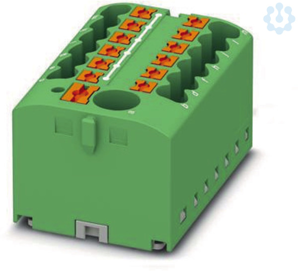 Verteilerblock, Grundklemme mit Einspeisung, Nennspannung: 450 V, Nennstrom: 24 A, Anzahl der Anschlüsse: 13, Anschlussart: Push-in-Anschluss, Bemessungsquerschnitt: 2,5 mm², Abgriff, Querschnitt: 0,14 mm² - 4 mm², Push-in-Anschluss, Sammelanschluss, Bemessungsquerschnitt: 6 mm², Querschnitt: 0,5 mm² - 10 mm², Montageart: aufrasten auf Tragschienenadapter, Direktmontage mit Flansch, Fliegend, Farbe: grün