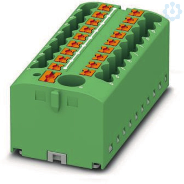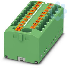 Verteilerblock, Grundklemme mit Einspeisung, Nennspannung: 450 V, Nennstrom: 24 A, Anzahl der Anschlüsse: 19, Anschlussart: Push-in-Anschluss, Bemessungsquerschnitt: 2,5 mm², Abgriff, Querschnitt: 0,14 mm² - 4 mm², Push-in-Anschluss, Sammelanschluss, Bemessungsquerschnitt: 6 mm², Querschnitt: 0,5 mm² - 10 mm², Montageart: aufrasten auf Tragschienenadapter, Direktmontage mit Flansch, Fliegend, Farbe: grün