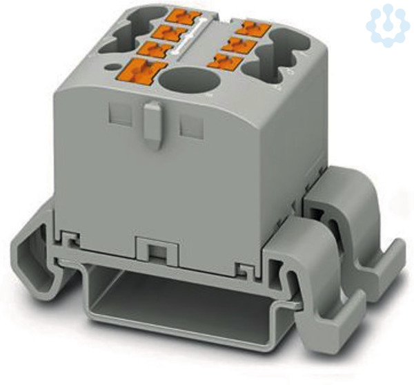 Verteilerblock, Block mit waagerechter Ausrichtung und integrierter Einspeisung, Nennspannung: 690 V, Nennstrom: 24 A, Anzahl der Anschlüsse: 7, Anschlussart: Push-in-Anschluss, Bemessungsquerschnitt: 2,5 mm², Abgriff, Querschnitt: 0,14 mm² - 4 mm², Push-in-Anschluss, Sammelanschluss, Bemessungsquerschnitt: 6 mm², Querschnitt: 0,5 mm² - 10 mm², Montageart: NS 35/7,5, NS 35/15, Farbe: grau