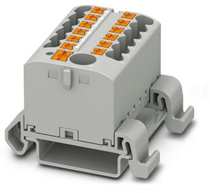 Verteilerblock, Block mit waagerechter Ausrichtung und integrierter Einspeisung, Nennspannung: 690 V, Nennstrom: 24 A, Anzahl der Anschlüsse: 13, Anschlussart: Push-in-Anschluss, Bemessungsquerschnitt: 2,5 mm², Abgriff, Querschnitt: 0,14 mm² - 4 mm², Push-in-Anschluss, Sammelanschluss, Bemessungsquerschnitt: 6 mm², Querschnitt: 0,5 mm² - 10 mm², Montageart: NS 35/7,5, NS 35/15, Farbe: grau