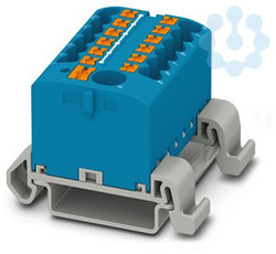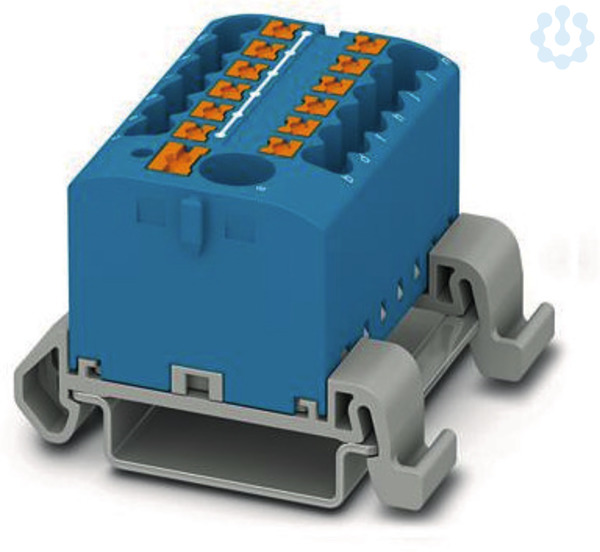 Verteilerblock, Block mit waagerechter Ausrichtung und integrierter Einspeisung, Nennspannung: 690 V, Nennstrom: 24 A, Anzahl der Anschlüsse: 13, Anschlussart: Push-in-Anschluss, Bemessungsquerschnitt: 2,5 mm², Abgriff, Querschnitt: 0,14 mm² - 4 mm², Push-in-Anschluss, Sammelanschluss, Bemessungsquerschnitt: 6 mm², Querschnitt: 0,5 mm² - 10 mm², Montageart: NS 35/7,5, NS 35/15, Farbe: blau