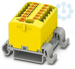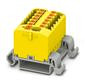 Verteilerblock, Block mit waagerechter Ausrichtung und integrierter Einspeisung, Nennspannung: 690 V, Nennstrom: 24 A, Anzahl der Anschlüsse: 13, Anschlussart: Push-in-Anschluss, Bemessungsquerschnitt: 2,5 mm², Abgriff, Querschnitt: 0,14 mm² - 4 mm², Push-in-Anschluss, Sammelanschluss, Bemessungsquerschnitt: 6 mm², Querschnitt: 0,5 mm² - 10 mm², Montageart: NS 35/7,5, NS 35/15, Farbe: gelb