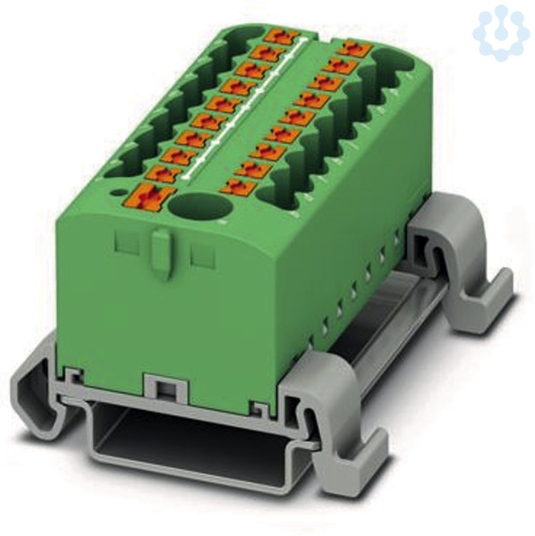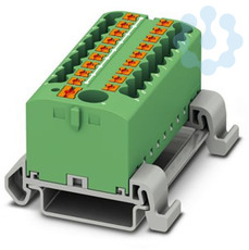 Verteilerblock, Block mit waagerechter Ausrichtung und integrierter Einspeisung, Nennspannung: 690 V, Nennstrom: 24 A, Anzahl der Anschlüsse: 19, Anschlussart: Push-in-Anschluss, Bemessungsquerschnitt: 2,5 mm², Abgriff, Querschnitt: 0,14 mm² - 4 mm², Push-in-Anschluss, Sammelanschluss, Bemessungsquerschnitt: 6 mm², Querschnitt: 0,5 mm² - 10 mm², Montageart: NS 35/7,5, NS 35/15, Farbe: grün