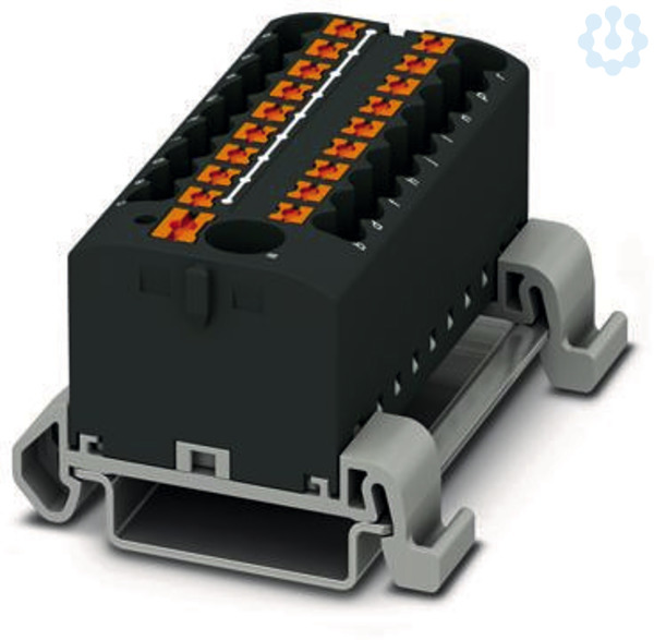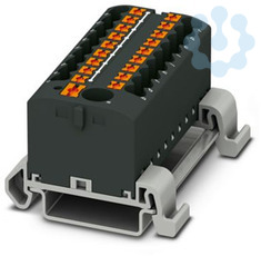 Verteilerblock, Block mit waagerechter Ausrichtung und integrierter Einspeisung, Nennspannung: 690 V, Nennstrom: 24 A, Anzahl der Anschlüsse: 19, Anschlussart: Push-in-Anschluss, Bemessungsquerschnitt: 2,5 mm², Abgriff, Querschnitt: 0,14 mm² - 4 mm², Push-in-Anschluss, Sammelanschluss, Bemessungsquerschnitt: 6 mm², Querschnitt: 0,5 mm² - 10 mm², Montageart: NS 35/7,5, NS 35/15, Farbe: schwarz