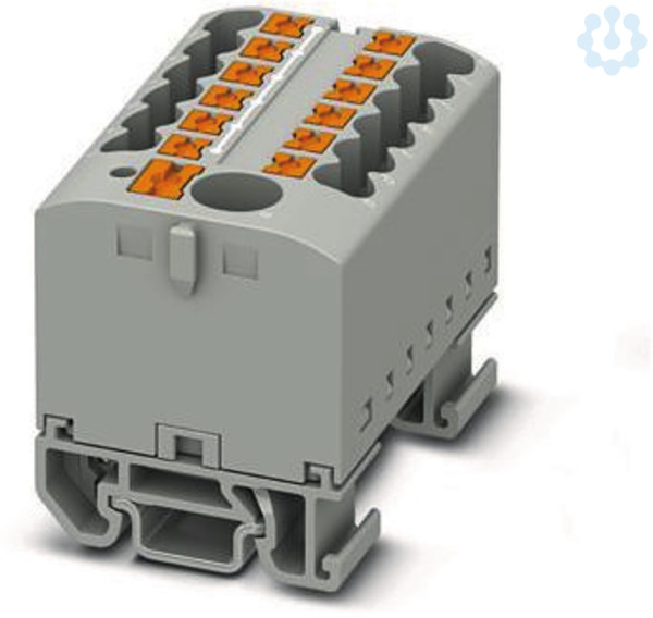 Verteilerblock, Block mit waagerechter Ausrichtung und integrierter Einspeisung, Nennspannung: 690 V, Nennstrom: 24 A, Anzahl der Anschlüsse: 13, Anschlussart: Push-in-Anschluss, Bemessungsquerschnitt: 2,5 mm², Abgriff, Querschnitt: 0,14 mm² - 4 mm², Push-in-Anschluss, Sammelanschluss, Bemessungsquerschnitt: 6 mm², Querschnitt: 0,5 mm² - 10 mm², Montageart: NS 15, Farbe: grau