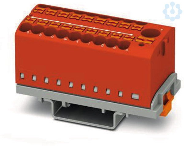 Verteilerblock, Block mit senkrechter Ausrichtung und integrierter Einspeisung, Nennspannung: 690 V, Nennstrom: 24 A, Anzahl der Anschlüsse: 19, Anschlussart: Push-in-Anschluss, Bemessungsquerschnitt: 2,5 mm², Abgriff, Querschnitt: 0,14 mm² - 4 mm², Push-in-Anschluss, Sammelanschluss, Bemessungsquerschnitt: 6 mm², Querschnitt: 0,5 mm² - 10 mm², Montageart: NS 35/7,5, NS 35/15, Farbe: rot