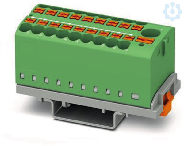 Verteilerblock, Block mit senkrechter Ausrichtung und integrierter Einspeisung, Nennspannung: 690 V, Nennstrom: 24 A, Anzahl der Anschlüsse: 19, Anschlussart: Push-in-Anschluss, Bemessungsquerschnitt: 2,5 mm², Abgriff, Querschnitt: 0,14 mm² - 4 mm², Push-in-Anschluss, Sammelanschluss, Bemessungsquerschnitt: 6 mm², Querschnitt: 0,5 mm² - 10 mm², Montageart: NS 35/7,5, NS 35/15, Farbe: grün
