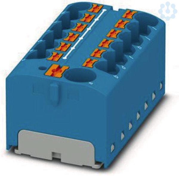 Verteilerblock, Nennspannung: 450 V, Nennstrom: 32 A, Anzahl der Anschlüsse: 13, Anschlussart: Push-in-Anschluss, Bemessungsquerschnitt: 4 mm², Abgriff, Querschnitt: 0,2 mm² - 6 mm², Push-in-Anschluss, Sammelanschluss, Bemessungsquerschnitt: 10 mm², Querschnitt: 0,5 mm² - 10 mm², Montageart: aufrasten auf Tragschienenadapter, Direktmontage mit Flansch, Fliegend, Farbe: blau