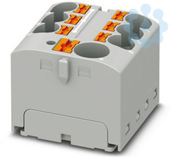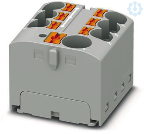 Verteilerblock, Grundklemme mit Einspeisung, Nennspannung: 450 V, Nennstrom: 32 A, Anzahl der Anschlüsse: 7, Anschlussart: Push-in-Anschluss, Bemessungsquerschnitt: 4 mm², Abgriff, Querschnitt: 0,2 mm² - 6 mm², Push-in-Anschluss, Sammelanschluss, Bemessungsquerschnitt: 10 mm², Querschnitt: 0,5 mm² - 10 mm², Montageart: aufrasten auf Tragschienenadapter, Direktmontage mit Flansch, Fliegend, Farbe: grau