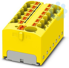 Verteilerblock, Nennspannung: 450 V, Nennstrom: 32 A, Anzahl der Anschlüsse: 13, Anschlussart: Push-in-Anschluss, Bemessungsquerschnitt: 4 mm², Abgriff, Querschnitt: 0,2 mm² - 6 mm², Push-in-Anschluss, Sammelanschluss, Bemessungsquerschnitt: 10 mm², Querschnitt: 0,5 mm² - 10 mm², Montageart: aufrasten auf Tragschienenadapter, Direktmontage mit Flansch, Fliegend, Farbe: gelb