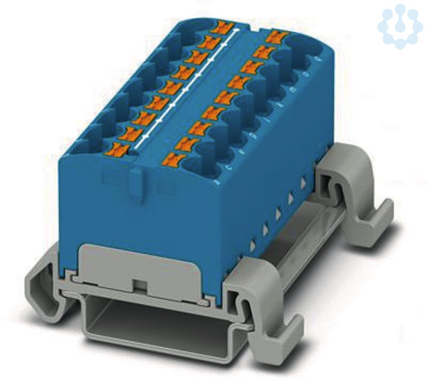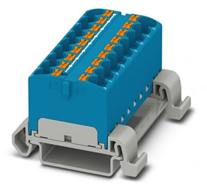 Verteilerblock, Block mit waagerechter Ausrichtung, Nennspannung: 800 V, Nennstrom: 32 A, Anzahl der Anschlüsse: 18, Anschlussart: Push-in-Anschluss, Querschnitt: 0,2 mm² - 6 mm², Montageart: NS 35/7,5, NS 35/15, Farbe: blau