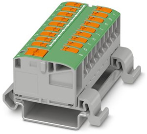 Verteilerblock, Nennspannung: 690 V, Nennstrom: 24 A, Anschlussart: Push-in-Anschluss, Abgriff, Bemessungsquerschnitt: 2,5 mm², Querschnitt: 0,14 mm² - 4 mm², Sammelanschluss, Bemessungsquerschnitt: 6 mm², Querschnitt: 0,5 mm² - 10 mm², Montageart: NS 35/7,5, NS 35/15, Farbe: grün